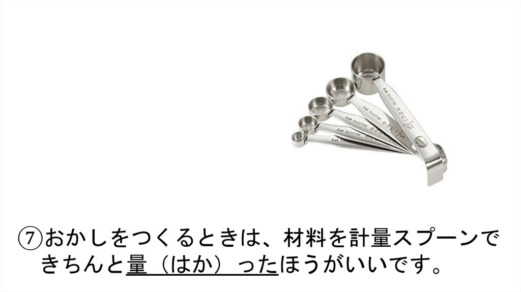 ⑦おかしをつくるときは、材料を計量スプーンできちんと量 はか ったほうがいいです。