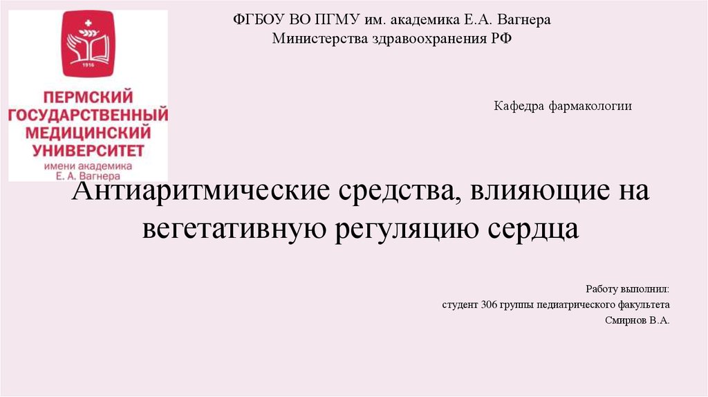 1. ФГБОУ ВО ПГМУ им. академика Е.А. Вагнера Министерства здравоохранения РФ Кафедра фармакологии