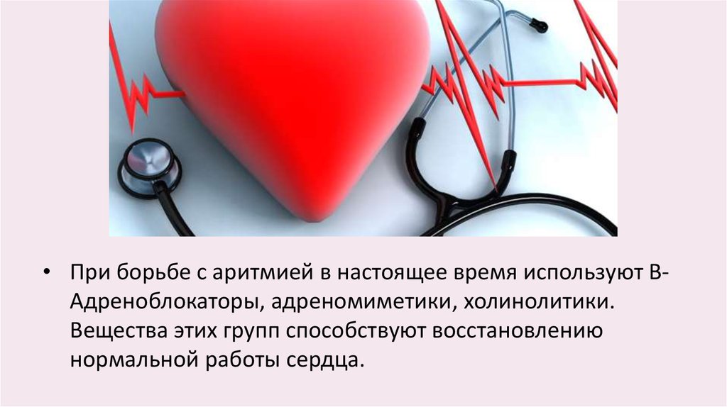 • При борьбе с аритмией в настоящее время используют BАдреноблокаторы, адреномиметики, холинолитики.Вещества этих групп способствуют восстановлению