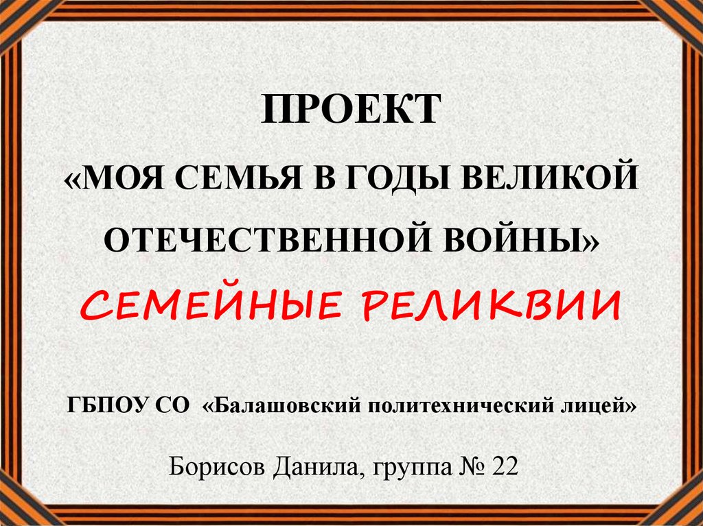 ПРОЕКТ«МОЯ СЕМЬЯ В ГОДЫ ВЕЛИКОЙ