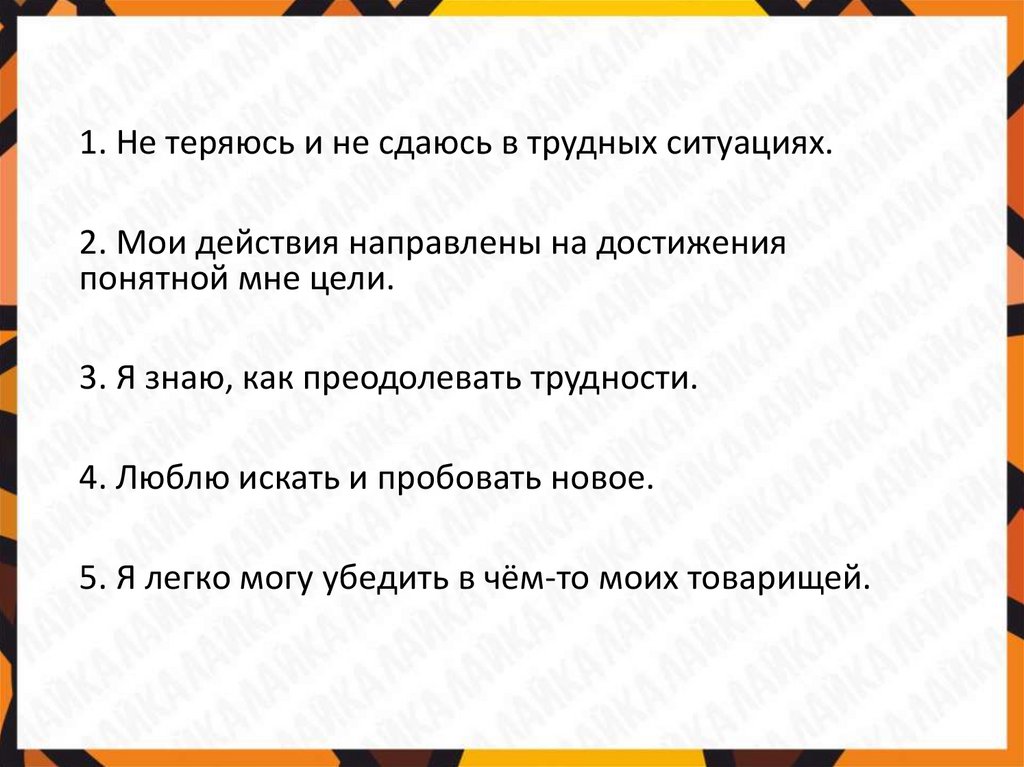 1. Не теряюсь и не сдаюсь в трудных ситуациях.2. Мои действия направлены на достижения