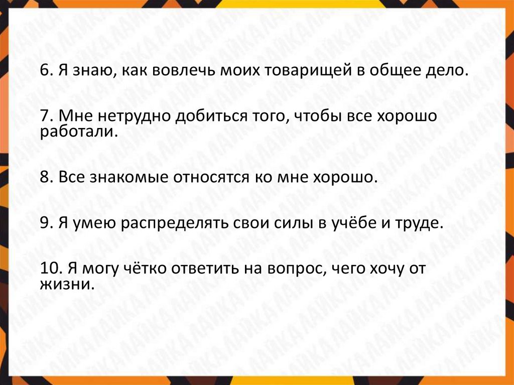6. Я знаю, как вовлечь моих товарищей в общее дело.7. Мне нетрудно добиться того, чтобы все хорошо