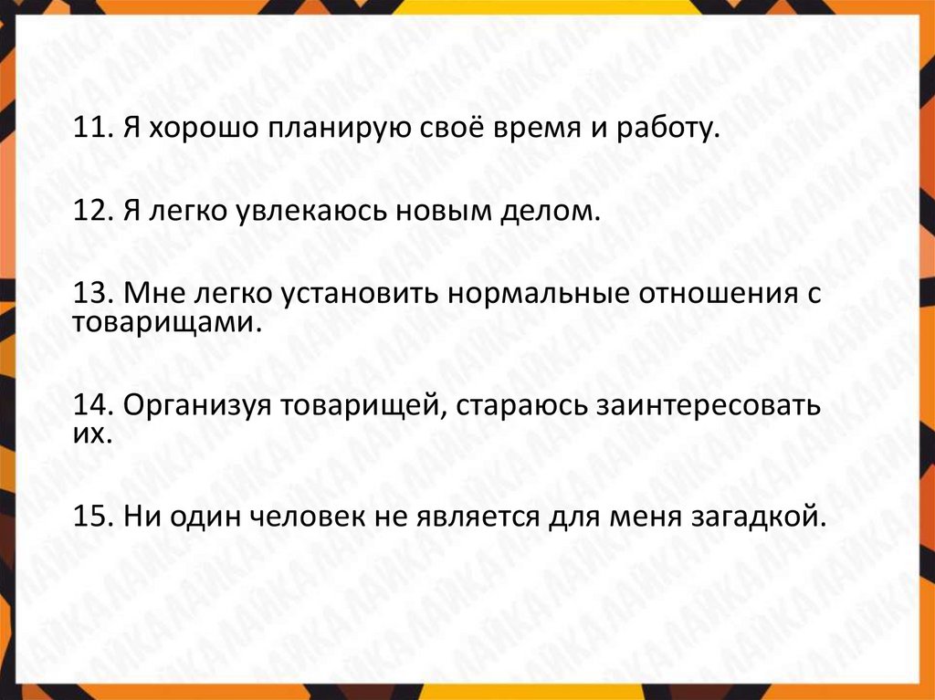 11. Я хорошо планирую своё время и работу.12. Я легко увлекаюсь новым делом.