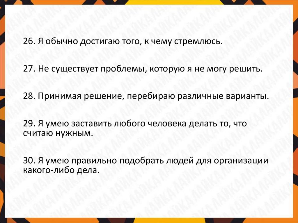 26. Я обычно достигаю того, к чему стремлюсь.27. Не существует проблемы, которую я не могу решить.