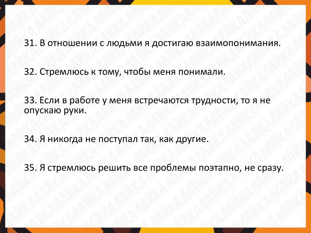 31. В отношении с людьми я достигаю взаимопонимания.32. Стремлюсь к тому, чтобы меня понимали.