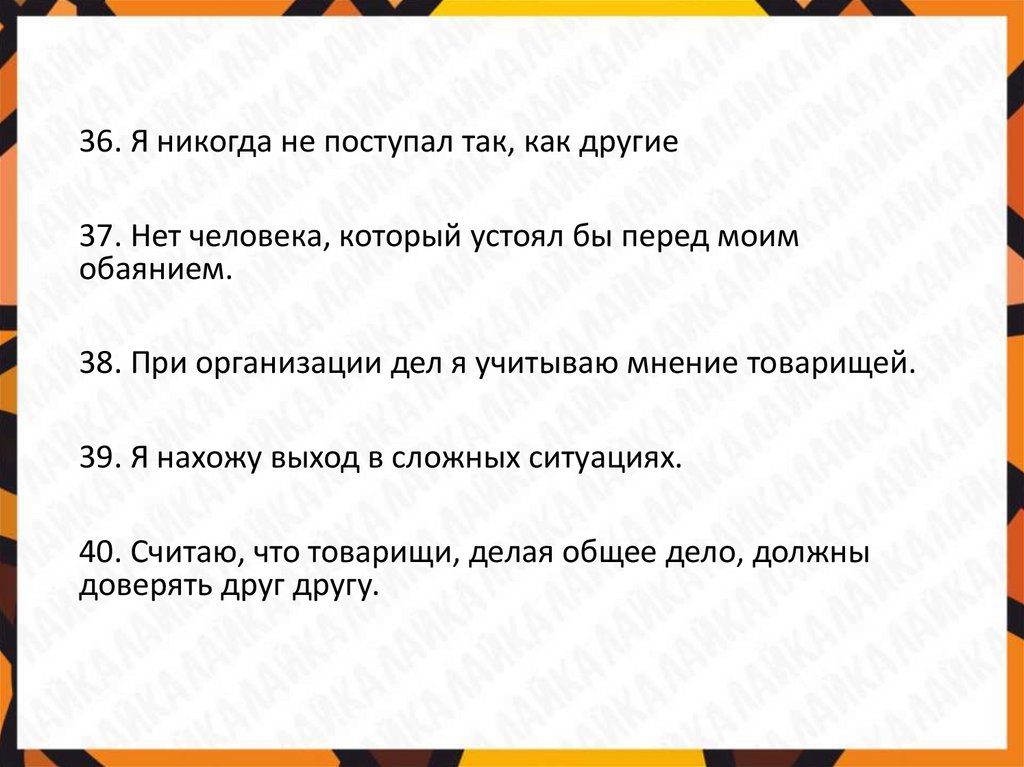 36. Я никогда не поступал так, как другие37. Нет человека, который устоял бы перед моим