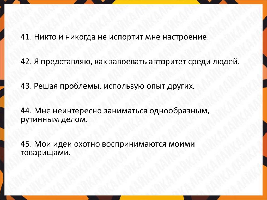 41. Никто и никогда не испортит мне настроение.42. Я представляю, как завоевать авторитет среди людей.