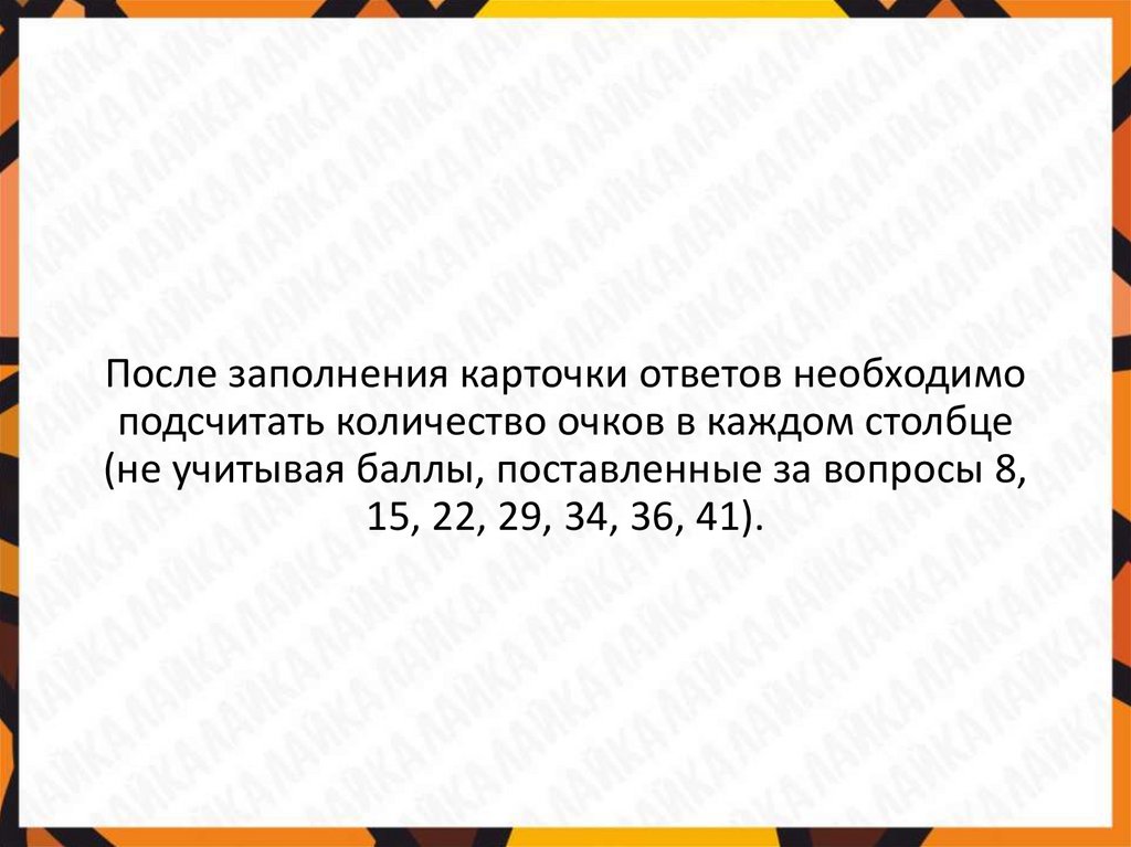 После заполнения карточки ответов необходимоподсчитать количество очков в каждом столбце