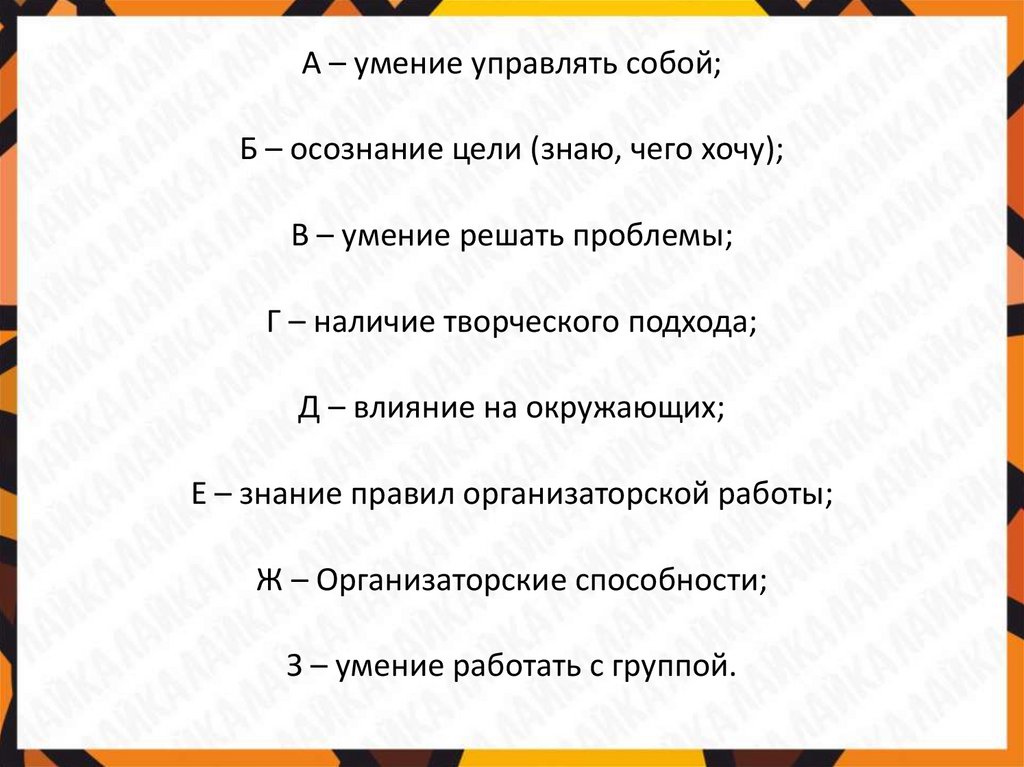 А – умение управлять собой;Б – осознание цели (знаю, чего хочу);