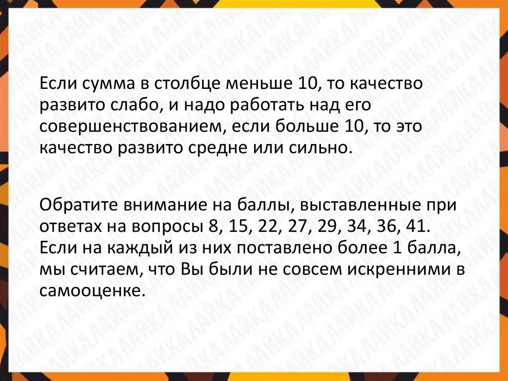Если сумма в столбце меньше 10, то качестворазвито слабо, и надо работать над его