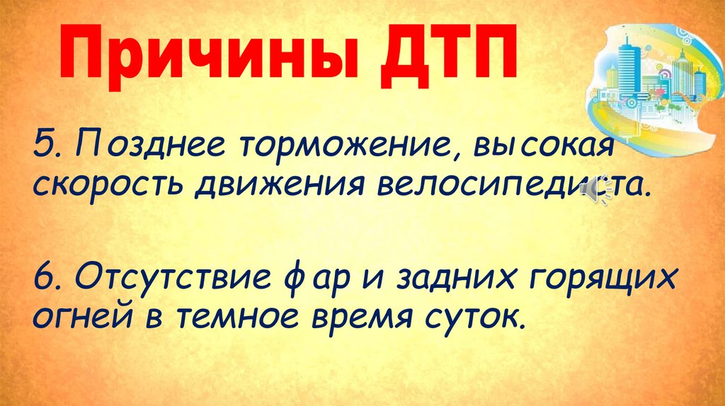 5. Позднее торможение, высокаяскорость движения велосипедиста.