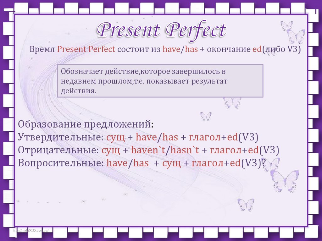 Время Present Perfect состоит из have/has + окончание ed(либо V3)Обозначает действие,которое завершилось в