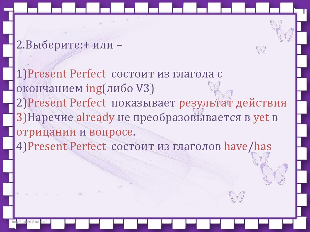 2.Выберите:+ или –1)Present Perfect состоит из глагола с