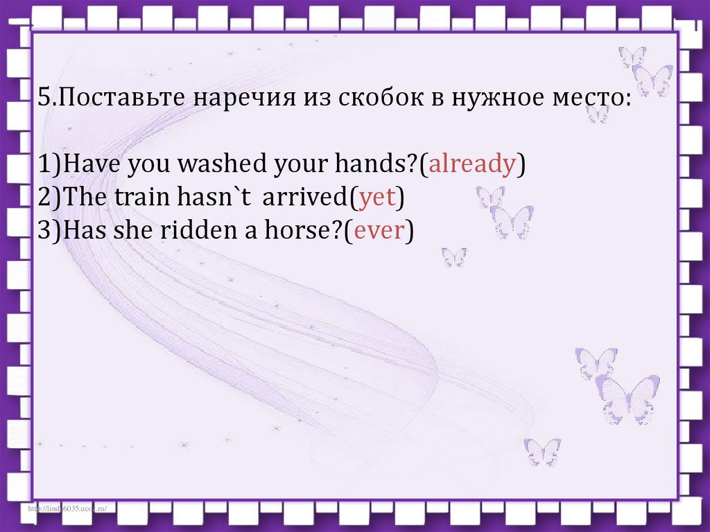 5.Поставьте наречия из скобок в нужное место:1)Have you washed your hands?(already)
