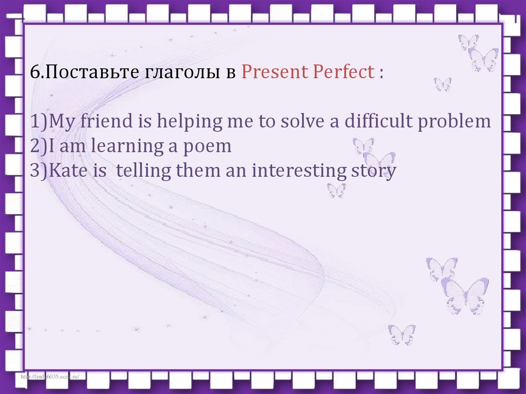 6.Поставьте глаголы в Present Perfect :1)My friend is helping me to solve a difficult problem