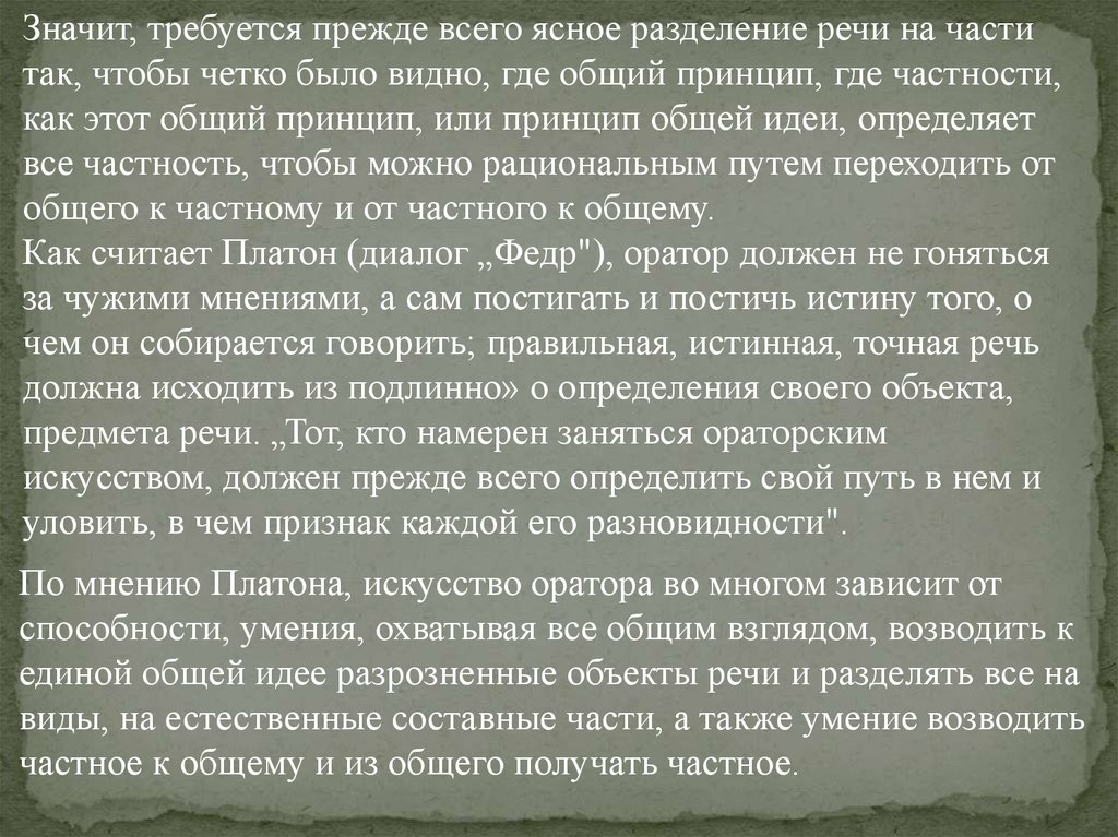 Значит, требуется прежде всего ясное разделение речи на частитак, чтобы четко было видно, где общий принцип, где частности,