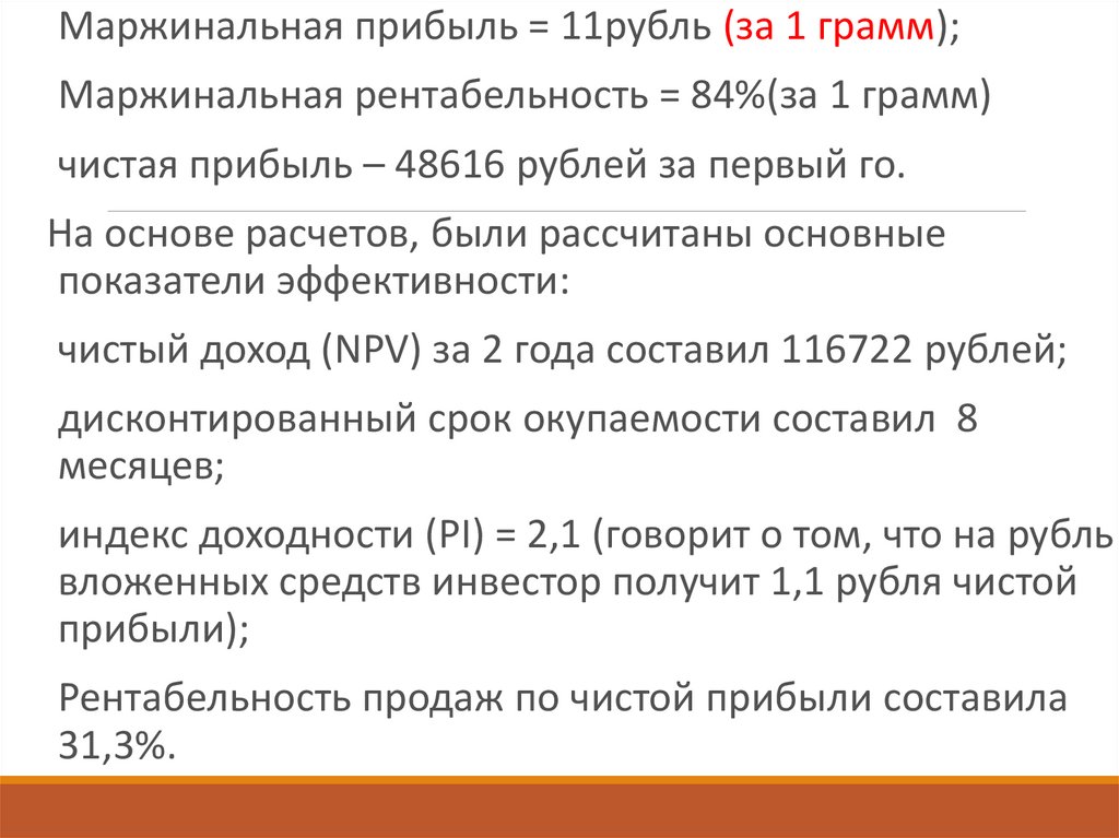 Маржинальная прибыль = 11рубль (за 1 грамм);Маржинальная рентабельность = 84%(за 1 грамм)