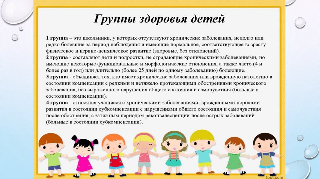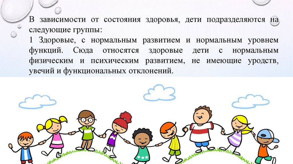 В зависимости от состояния здоровья, дети подразделяются наследующие группы: