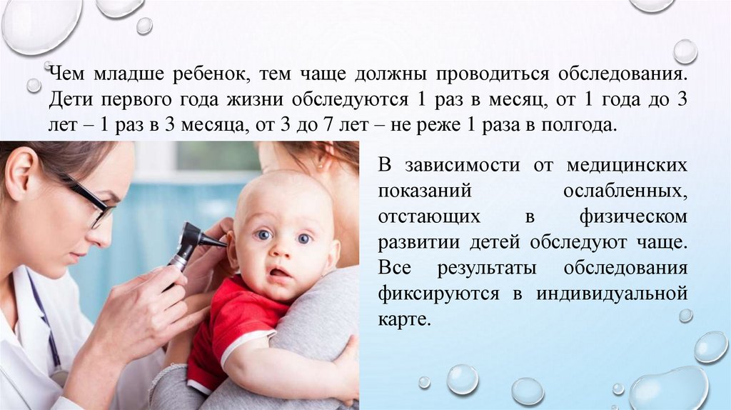Чем младше ребенок, тем чаще должны проводиться обследования.Дети первого года жизни обследуются 1 раз в месяц, от 1 года до 3