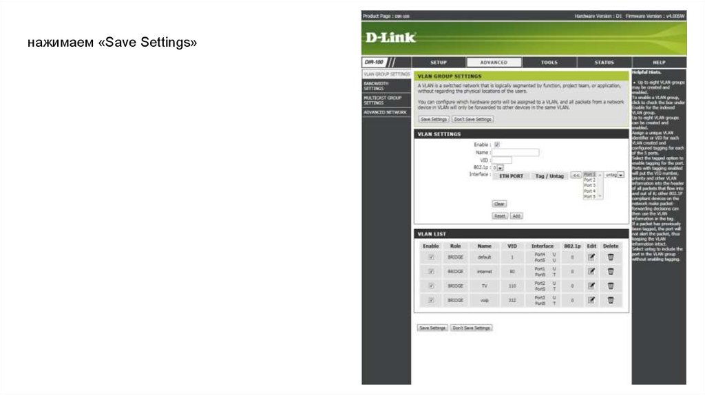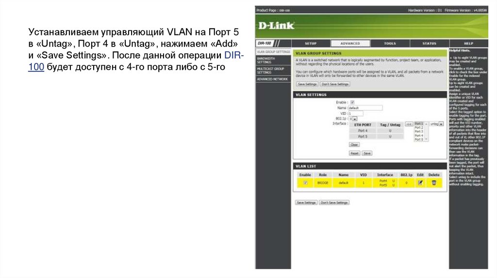 и «Save Settings». После данной операции DIR100 будет доступен с 4-го порта либо с 5-го