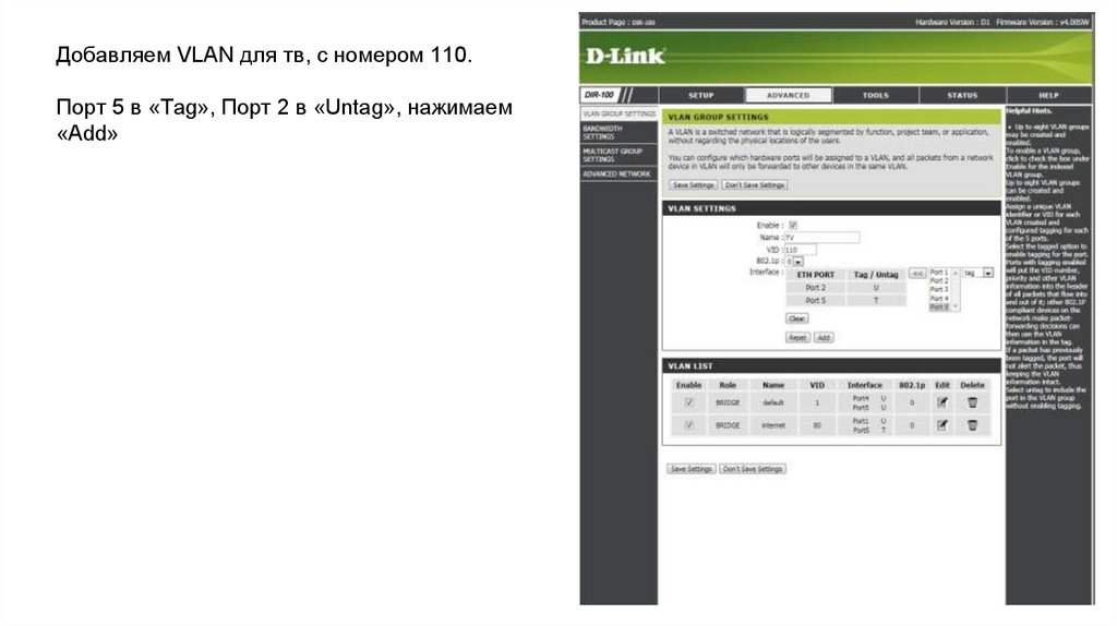 Добавляем VLAN для тв, с номером 110.Порт 5 в «Tag», Порт 2 в «Untag», нажимаем