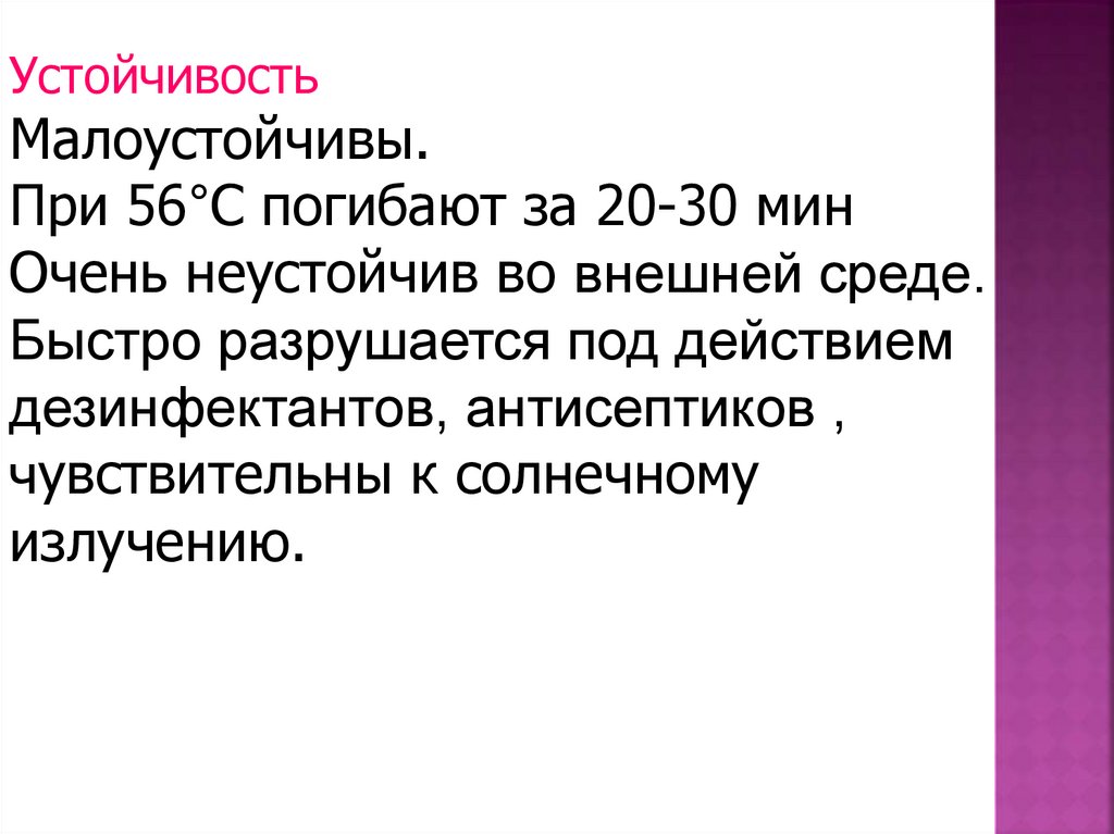 При 56°С погибают за 20-30 мин