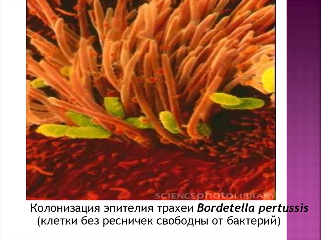 Колонизация эпителия трахеи Bordetella pertussis(клетки без ресничек свободны от бактерий)