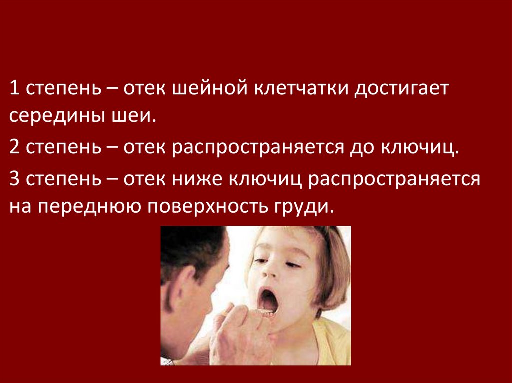 1 степень – отек шейной клетчатки достигаетсередины шеи.