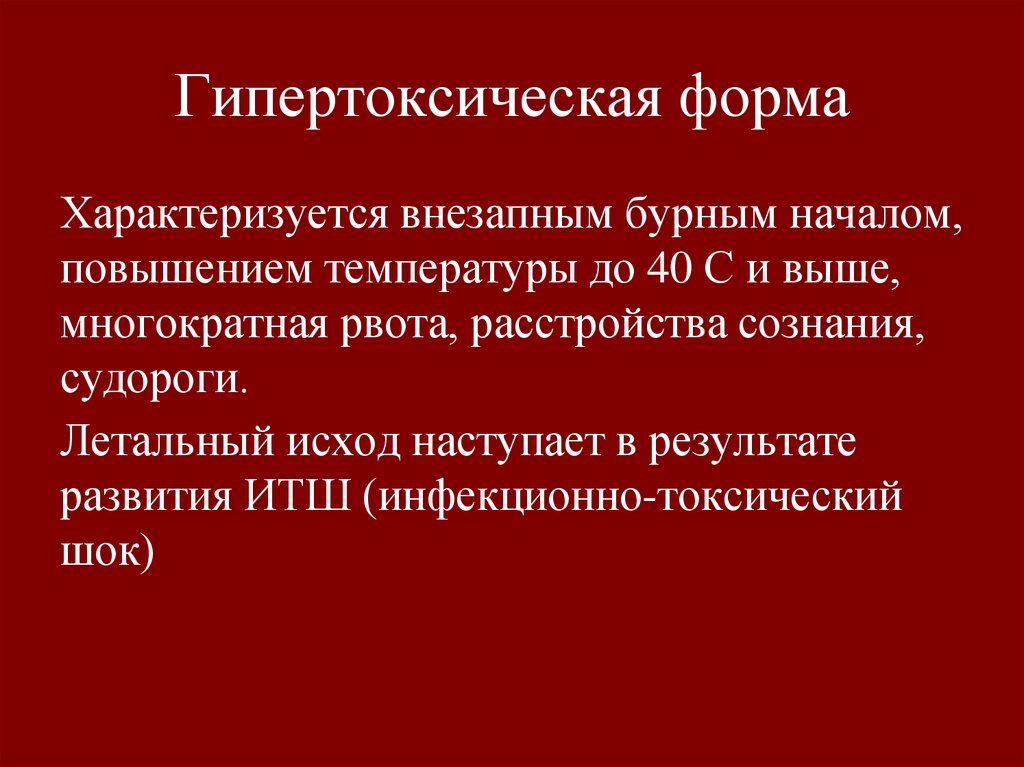 Гипертоксическая формаХарактеризуется внезапным бурным началом,
