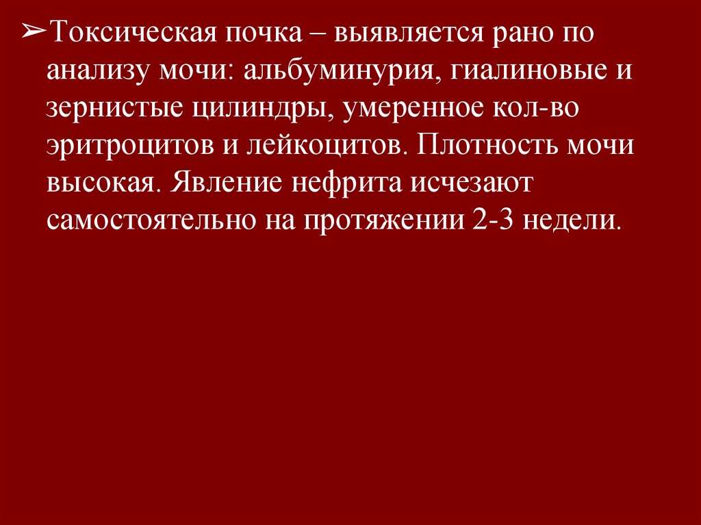 ➢Токсическая почка – выявляется рано поанализу мочи: альбуминурия, гиалиновые и