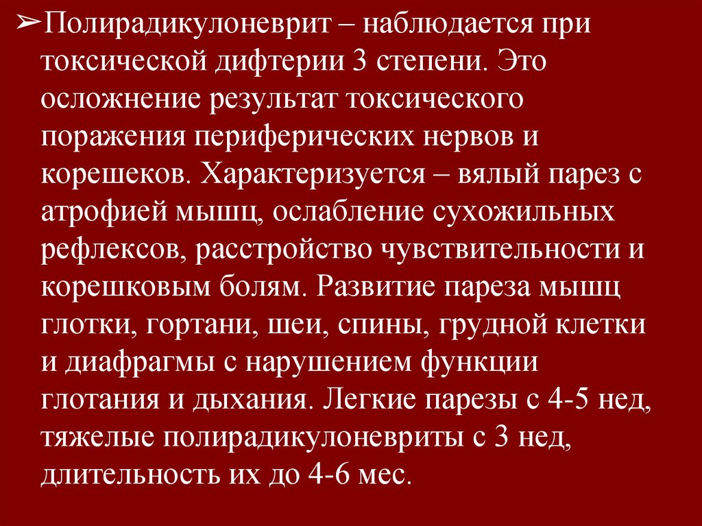 ➢Полирадикулоневрит – наблюдается притоксической дифтерии 3 степени. Это