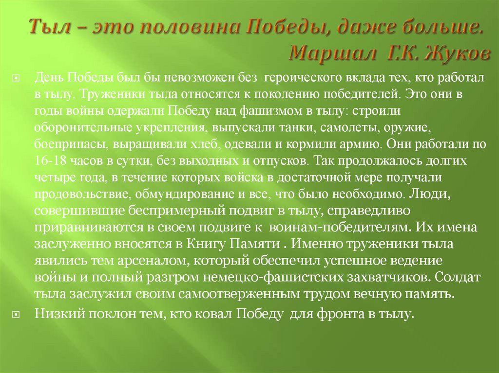 День Победы был бы невозможен без героического вклада тех, кто работалв тылу. Труженики тыла относятся к поколению победителей. Это они в