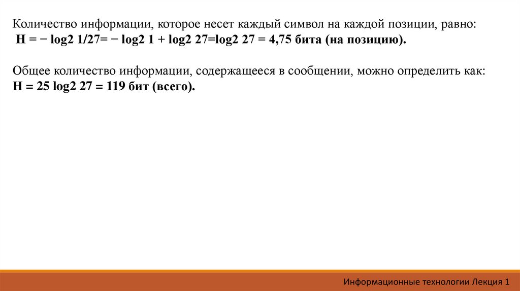 Количество информации, которое несет каждый символ на каждой позиции, равно:H = − log2 1/27= − log2 1 + log2 27=log2 27 = 4,75 бита (на позицию).