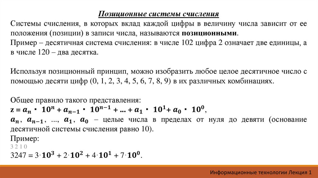 Пример – десятичная система счисления: в числе 102 цифра 2 означает две единицы, а