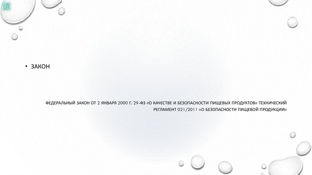 • ЗАКОНФЕДЕРАЛЬНЫЙ ЗАКОН ОТ 2 ЯНВАРЯ 2000 Г. 29-ФЗ «О КАЧЕСТВЕ И БЕЗОПАСНОСТИ ПИЩЕВЫХ ПРОДУКТОВ» ТЕХНИЧЕСКИЙ