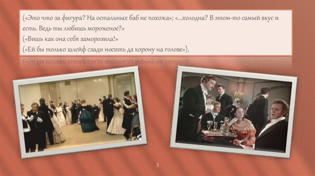 («Это что за фигура? На остальных баб не похожа»; «...холодна? В этом-то самый вкус иесть. Ведь ты любишь мороженое?»