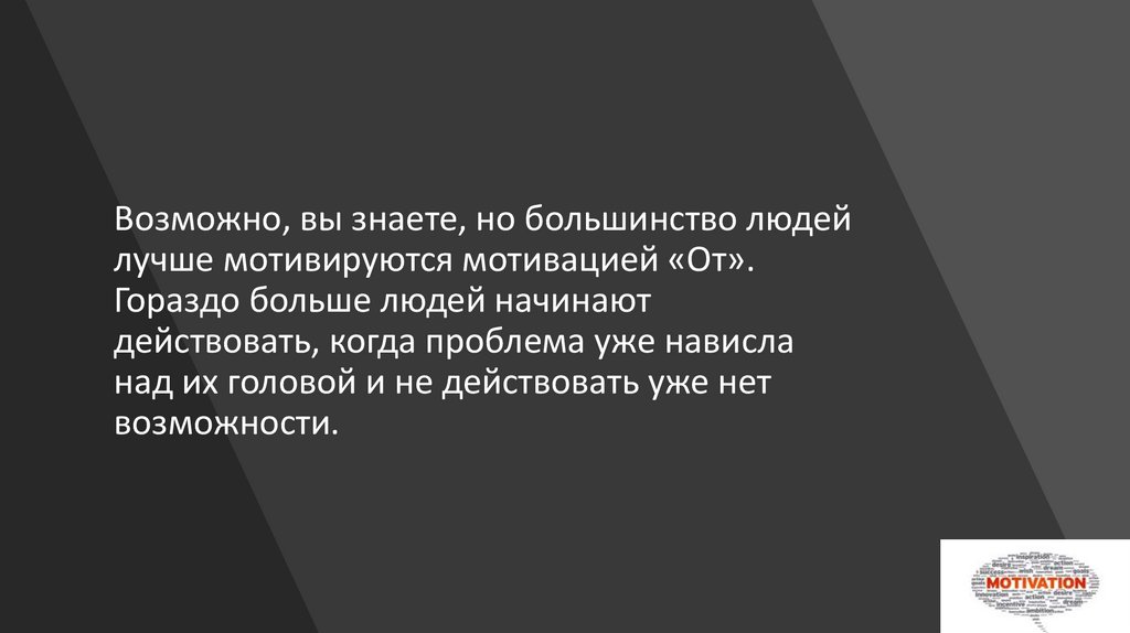 Возможно, вы знаете, но большинство людейлучше мотивируются мотивацией «От».