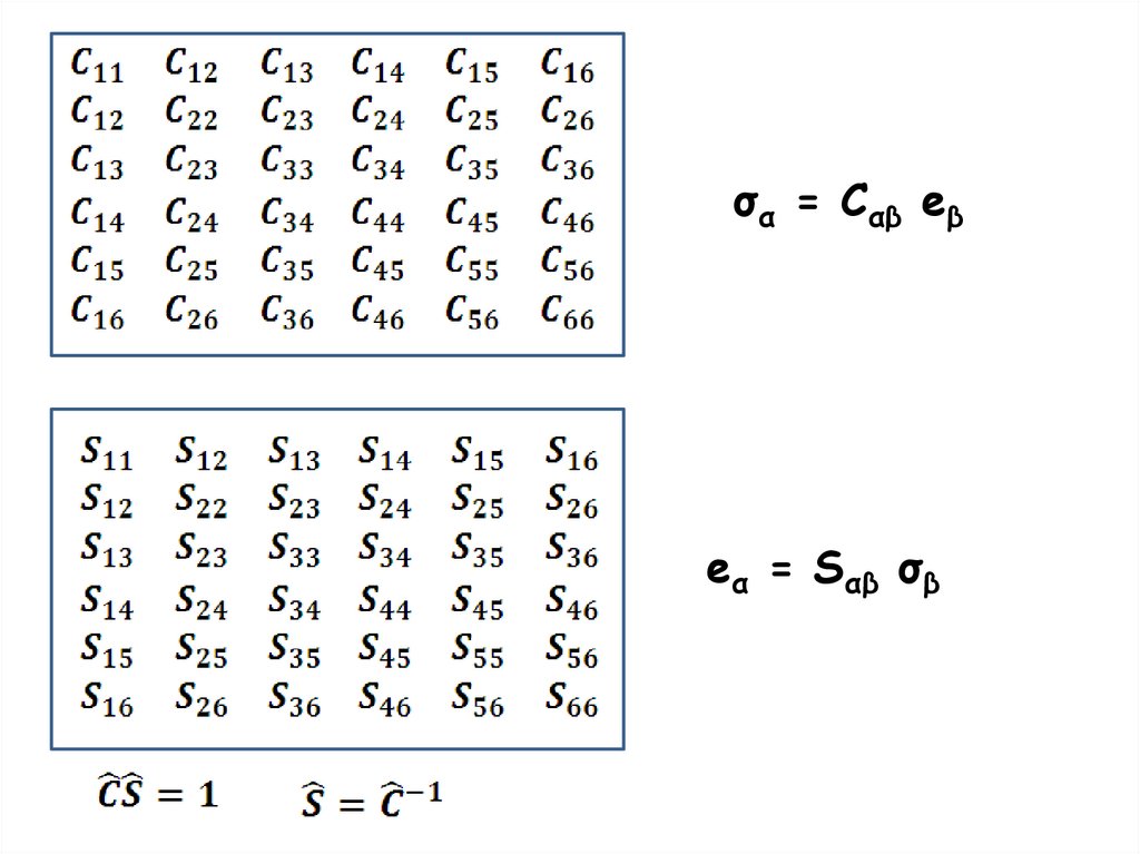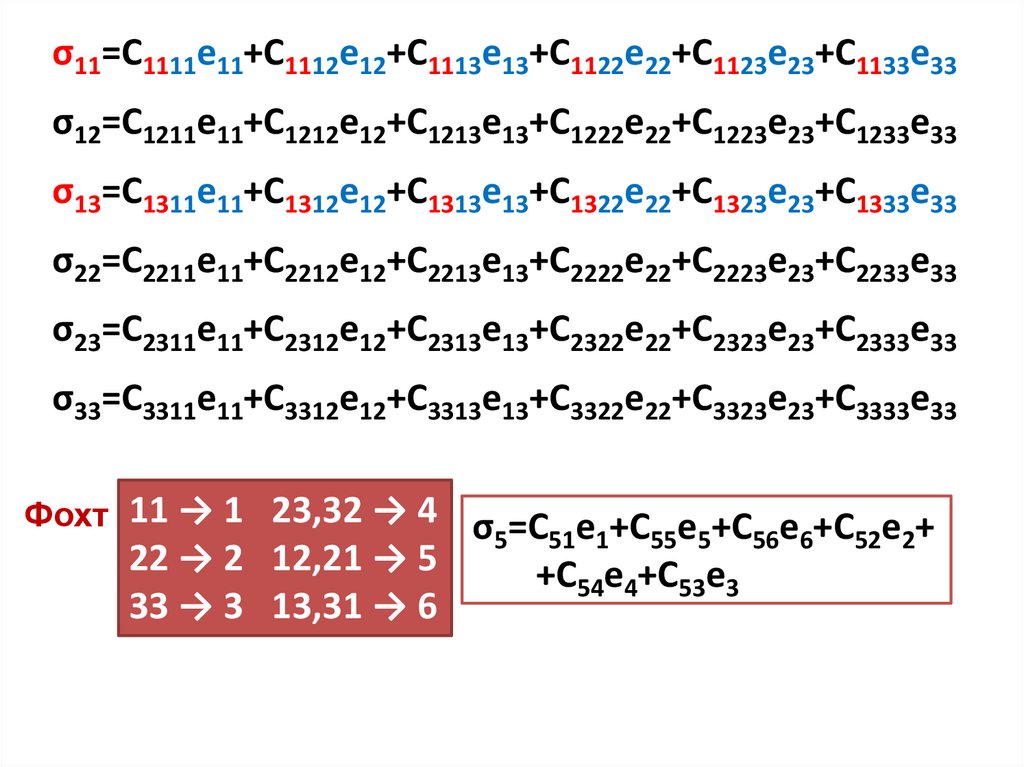 σ11=С1111e11+С1112e12+С1113e13+С1122e22+С1123e23+С1133e33σ12=С1211e11+С1212e12+С1213e13+С1222e22+С1223e23+С1233e33