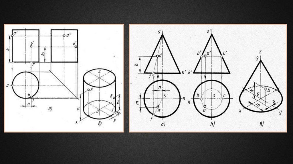 Задание 1. По двум проекциям построить третью проекцию, изометрическую проекциюи построить точки на поверхности геометрических тел. Линии построения сохранять!