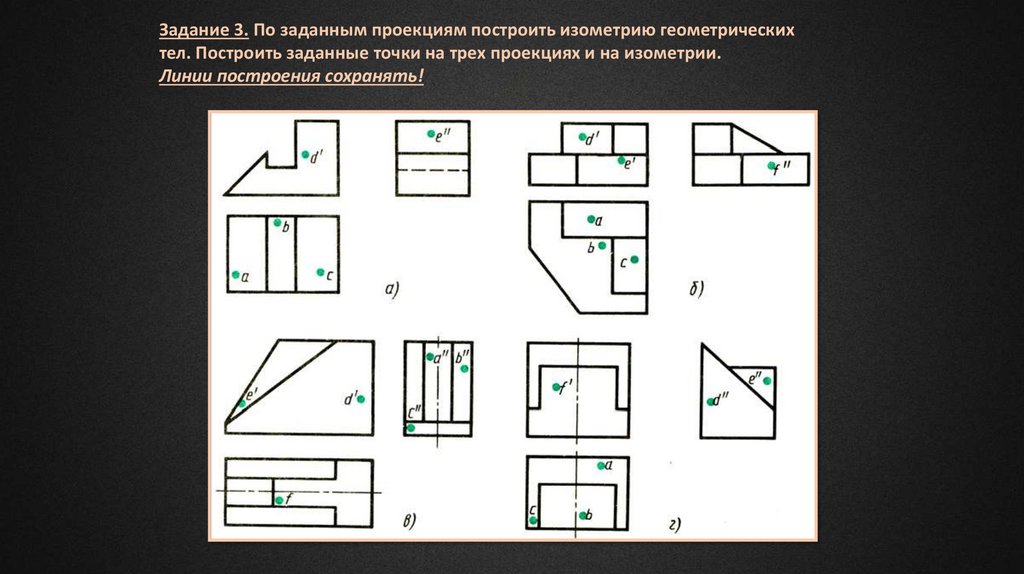 Задание 3. По заданным проекциям построить изометрию геометрическихтел. Построить заданные точки на трех проекциях и на изометрии.