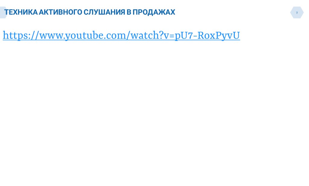 ТЕХНИКА АКТИВНОГО СЛУШАНИЯ В ПРОДАЖАХhttps://www.youtube.com/watch?v=pU7-RoxPyvU