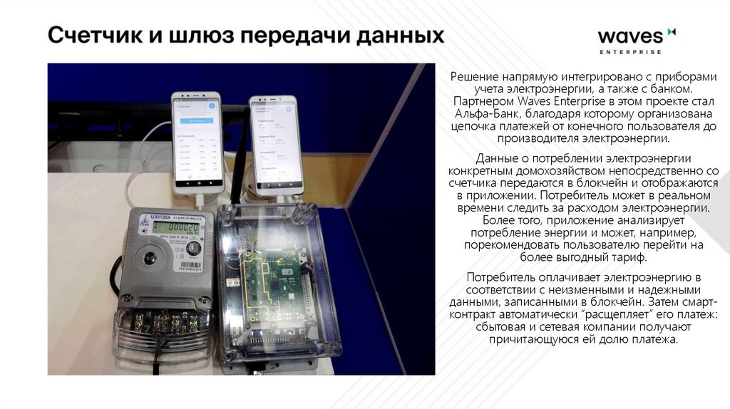 Решение напрямую интегрировано с приборамиучета электроэнергии, а также с банком.