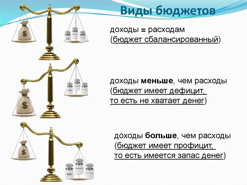 Виды бюджетовдоходы = расходам