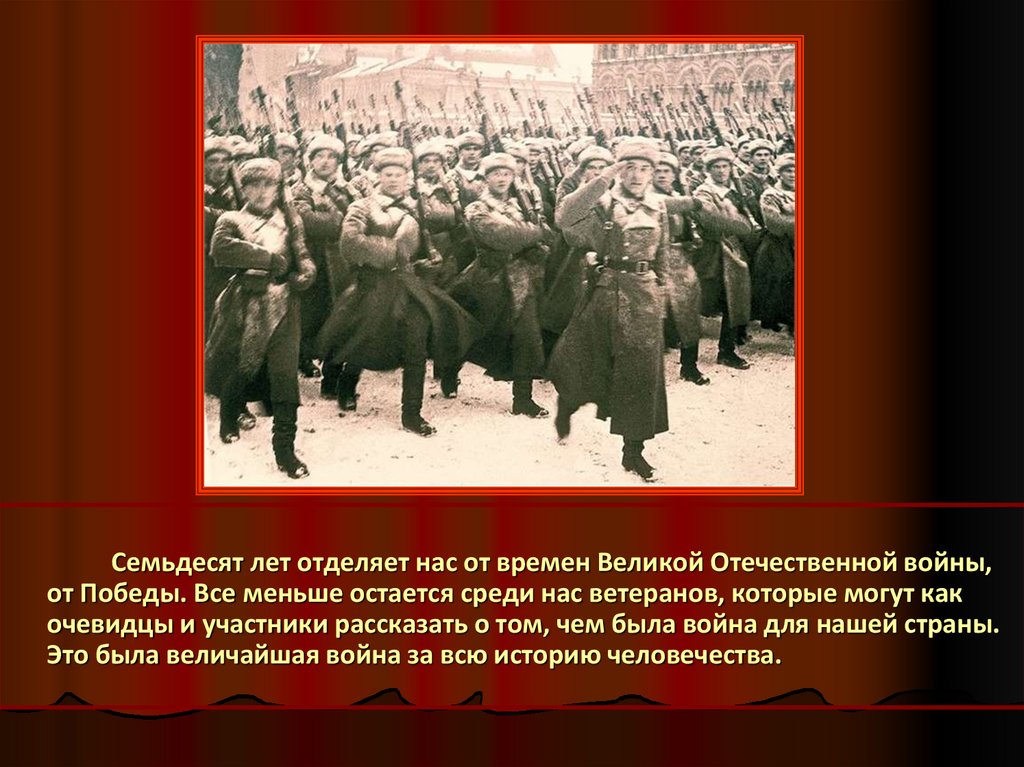 Семьдесят лет отделяет нас от времен Великой Отечественной войны,от Победы. Все меньше остается среди нас ветеранов, которые могут как