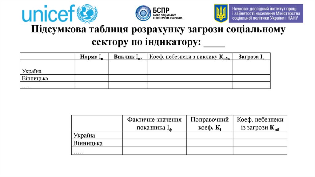 Підсумкова таблиця розрахунку загрози соціальномусектору по індикатору: ____