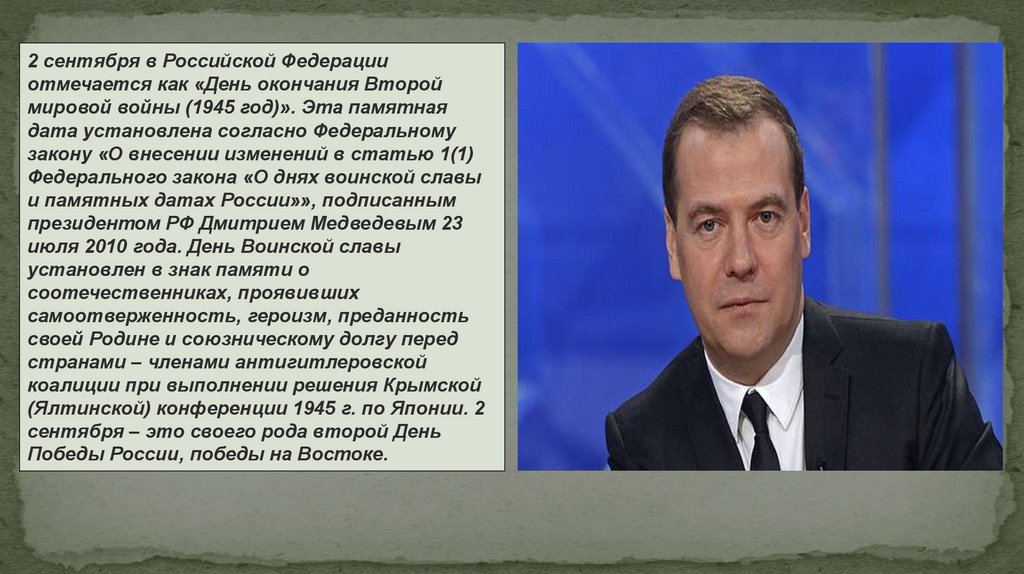 2 сентября в Российской Федерацииотмечается как «День окончания Второй