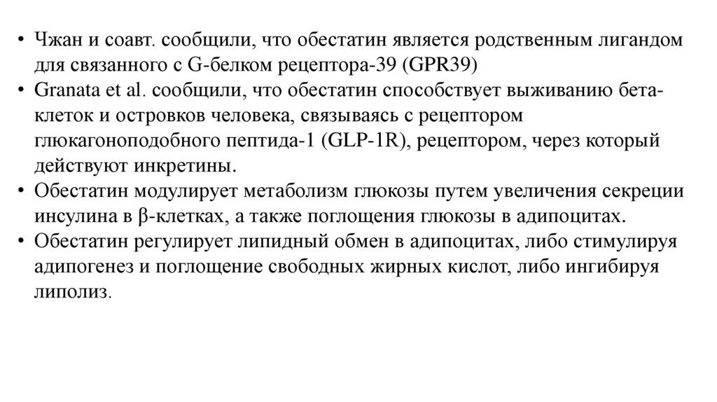 • Чжан и соавт. сообщили, что обестатин является родственным лигандомдля связанного с G-белком рецептора-39 (GPR39)