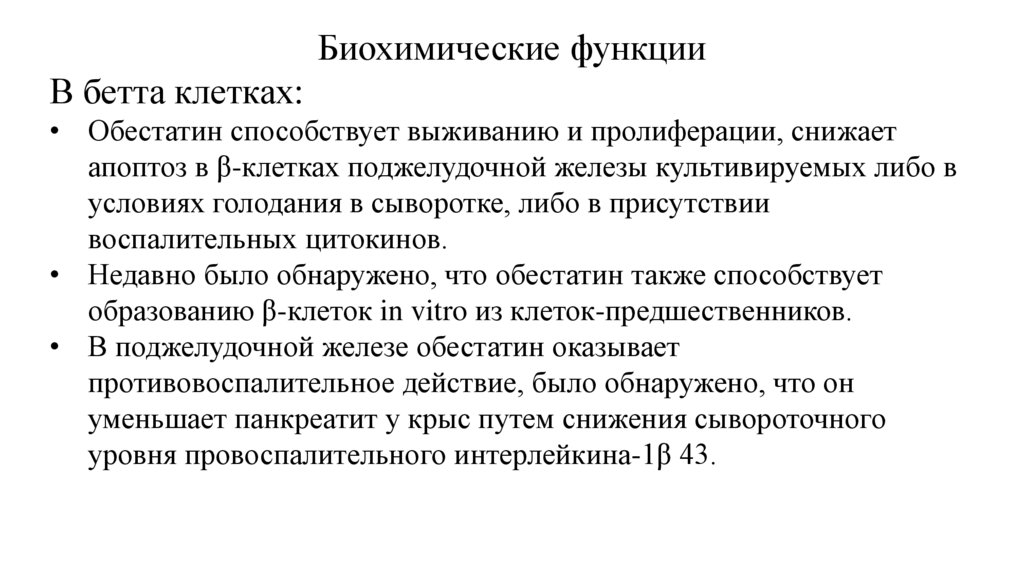 • Granata et al. сообщили, что обестатин способствует выживанию бетаклеток и островков человека, связываясь с рецептором