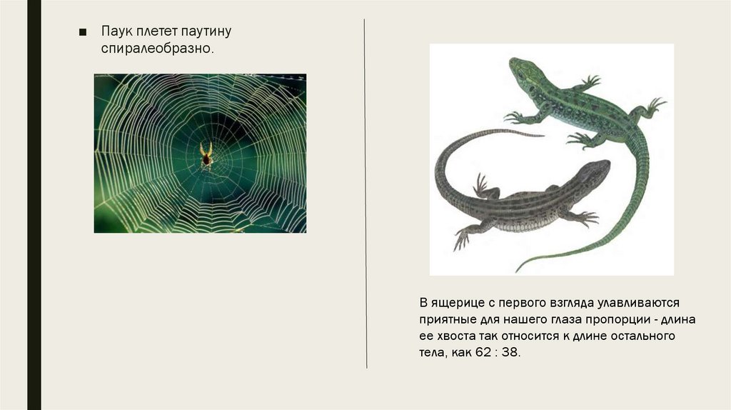 Раковина моллюсков закручена по золотой спирали. Паук плетет паутину по