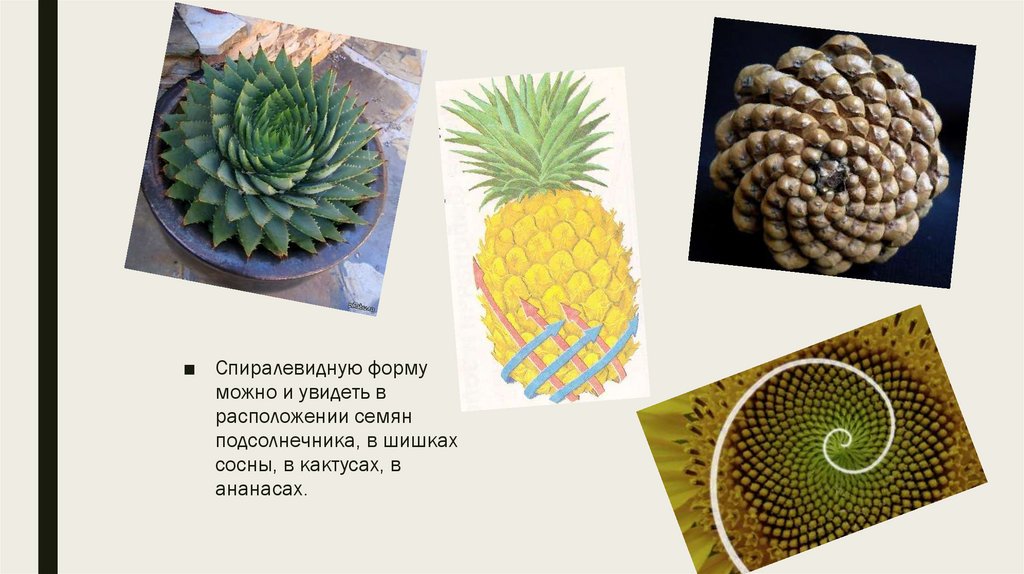 Спирально закручиваются усики растений, по золотой спирали проходит росттканей в стволах деревьев, по спирали расположены семечки в подсолнухе.